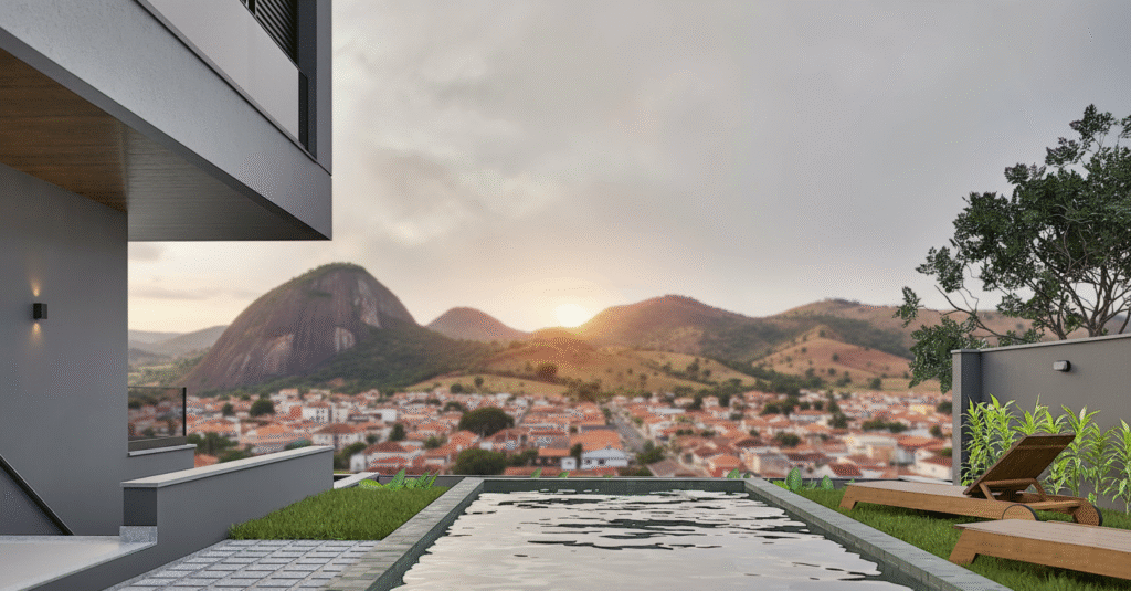 Uma arquitetura que se impõe com elegância, que brota do terreno e nele se ancora, ao mesmo tempo em que se abre – leve – para a paisagem e para o convívio.